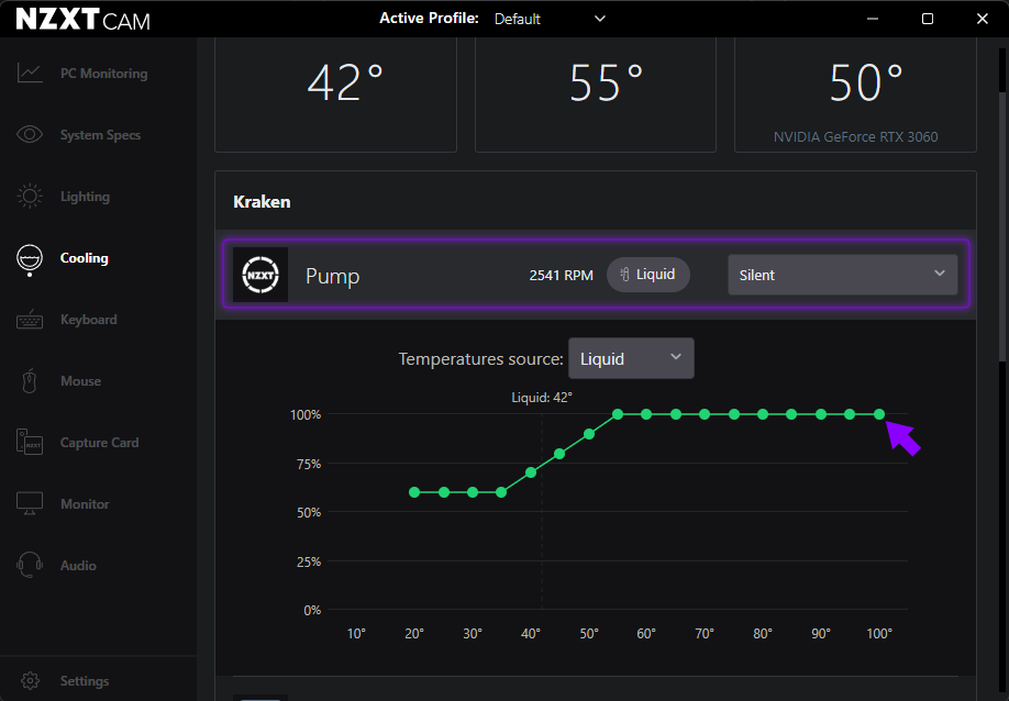 Sobald der PC wieder gestartet ist, stellen Sie die Pumpengeschwindigkeit auf 100 % (für CAM-betriebene Kraken) ein und lassen Sie das System mindestens 4 Stunden, idealerweise über Nacht, mit dieser Einstellung laufen, bevor Sie die Pumpengeschwindigkeit ändern.