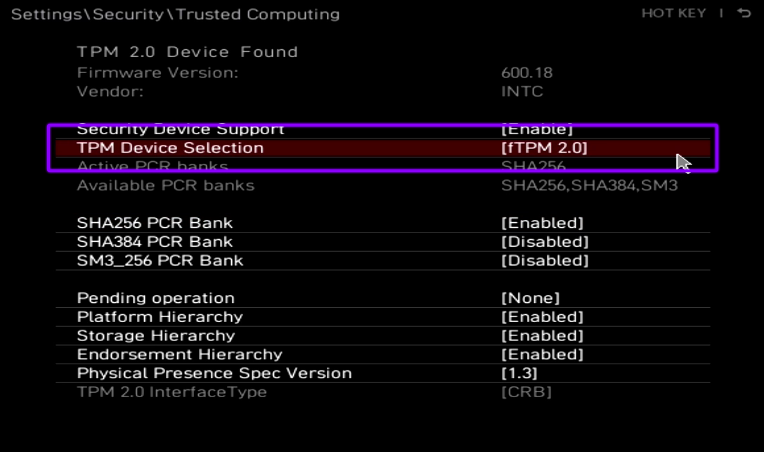 - TPM-Geräteauswahl sollte auf fTPM 2.0 gesetzt sein