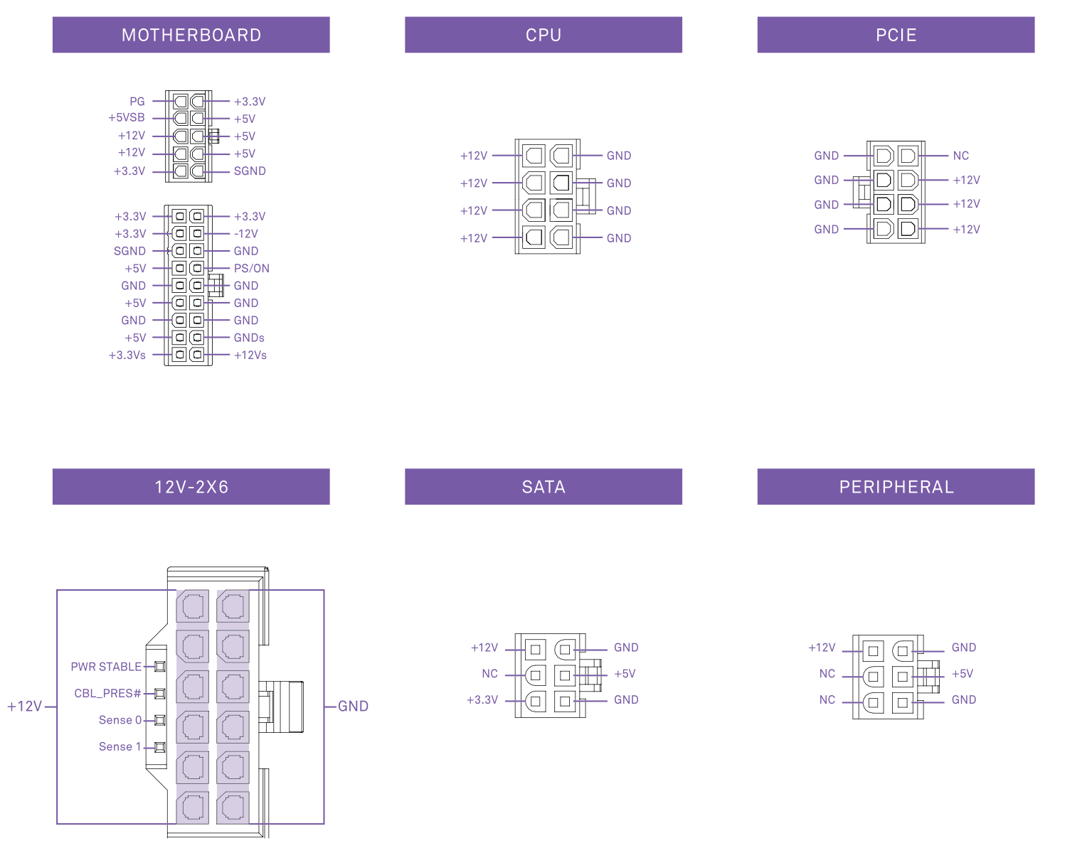 Das untenstehende Pinbelegungsdiagramm wird als Referenz für die C Series Gold Core Netzteile bereitgestellt. Diese Pinbelegung gilt nur für die folgenden Modelle: