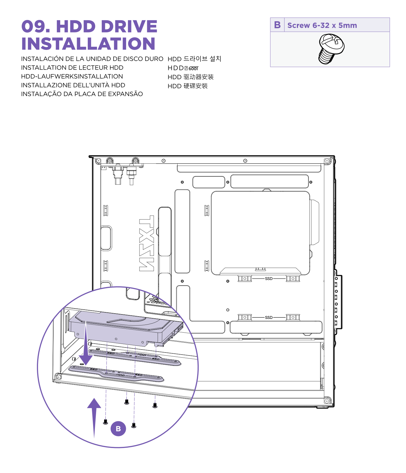 The bottom of the case can support a single 3.5" storage drive or device. This device can be secured using the included 6-32 x 5 mm screws from the accessory box.