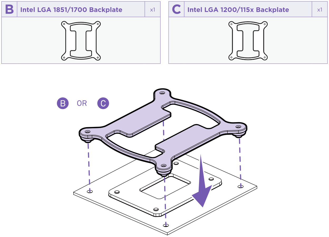 Align the backplate with the through-holes on the back of the motherboard near the socket.