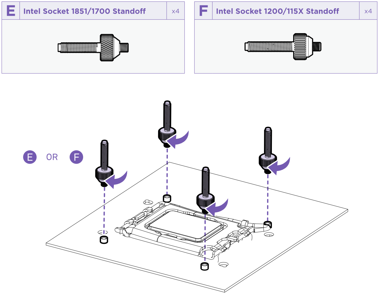 With the holes aligned, secure the backplate to the motherboard by screwing the short side of the E/F Intel Socket Standoff to the exposed posts on the socket side of the motherboard.