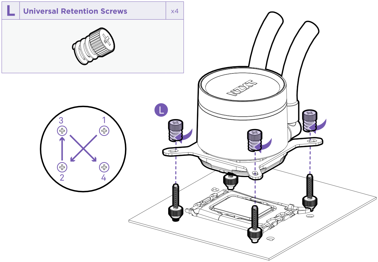 Start by loosely securing all four screws, then tighten the screws in an X-pattern as shown in the image above.