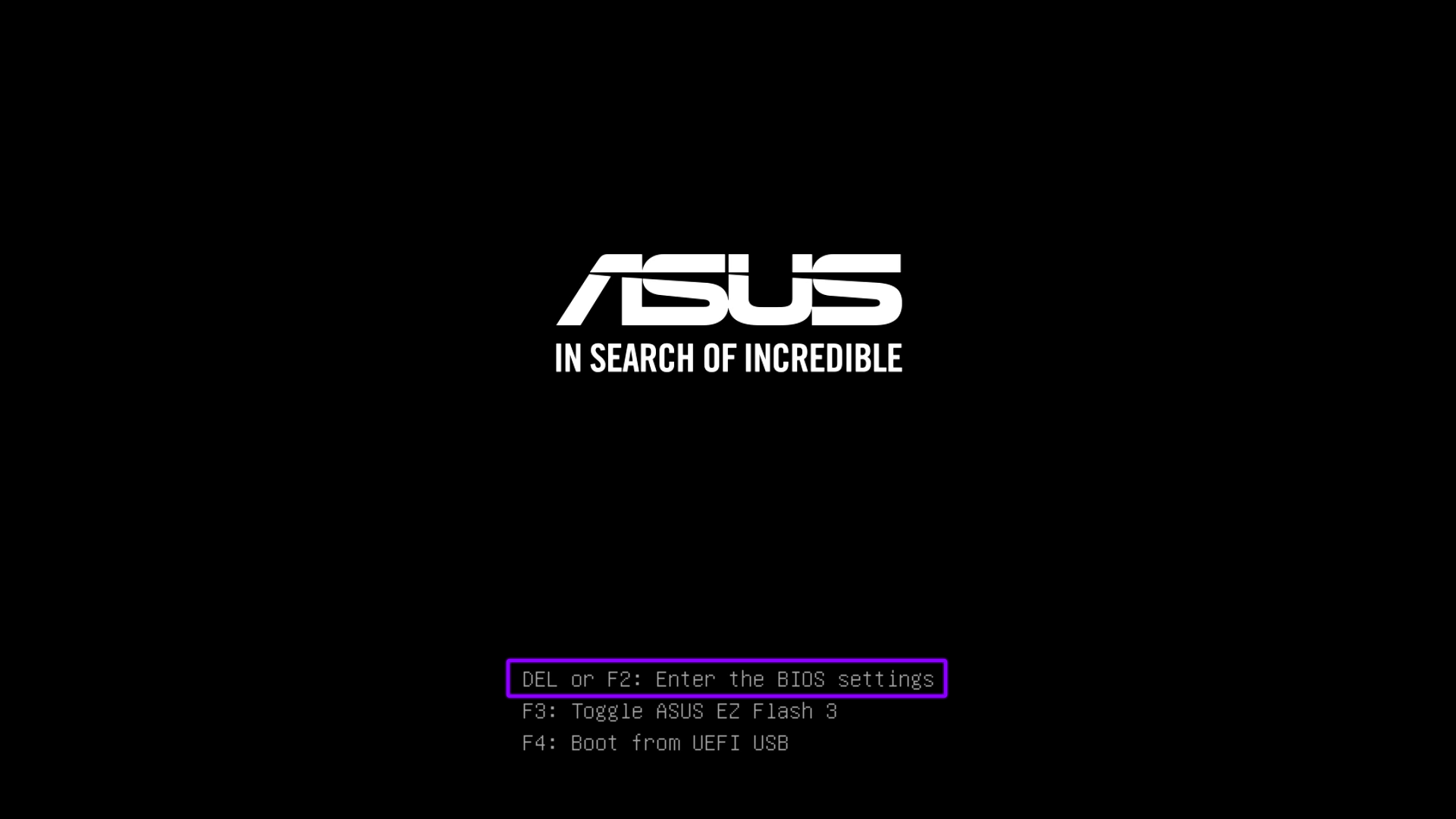 Para ajustar la configuración de Secure Boot necesitarás reiniciar tu PC en el UEFI. Esto se puede hacer reiniciando tu PC y presionando la tecla Delete en la pantalla de inicio de Asus como se muestra a continuación: