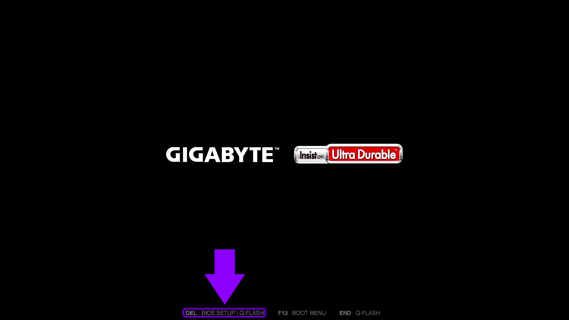 Para habilitar AMD EXPO™ o Intel® XMP, primero reinicia tu PC en el UEFI/BIOS. Esto se puede hacer presionando Delete en la pantalla de inicio como se muestra arriba.