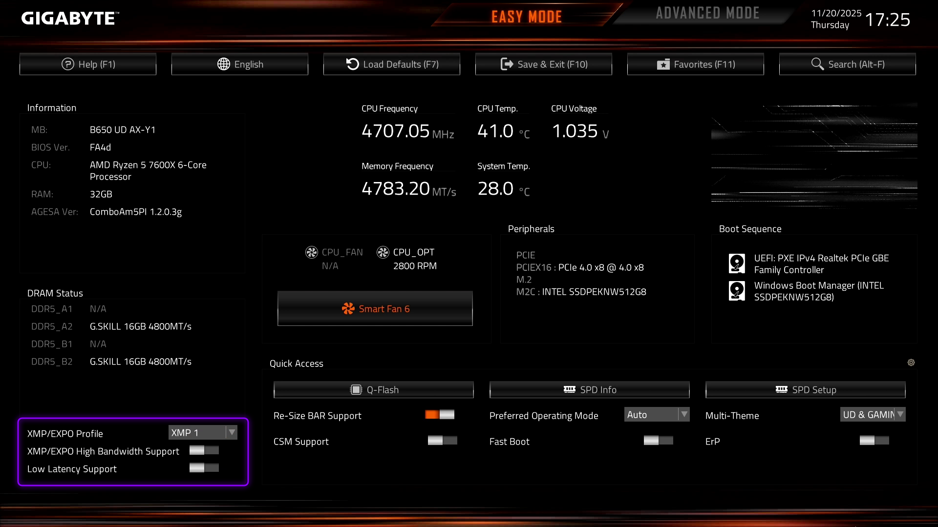 Por defecto, la mayoría de los PCs Gaming arrancarán en Modo Fácil para el BIOS como se muestra arriba. Para habilitar AMD EXPO™ o Intel® XMP, selecciona el desplegable en la esquina inferior izquierda y elige uno de los perfiles proporcionados. Algunos kits de RAM pueden incluir múltiples perfiles, sin embargo, se recomienda seleccionar el perfil que coincida con tu plataforma si está disponible.