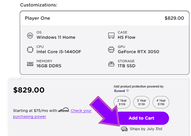 Lors de la commande d'un PC de jeu, si le système n'est pas immédiatement prêt à être expédié, il peut y avoir un temps de traitement supplémentaire pour que notre équipe assemble et vérifie la qualité du système avant l'expédition. Une estimation à jour de la date d'expédition d'un PC sera affichée sous le bouton Ajouter au panier .