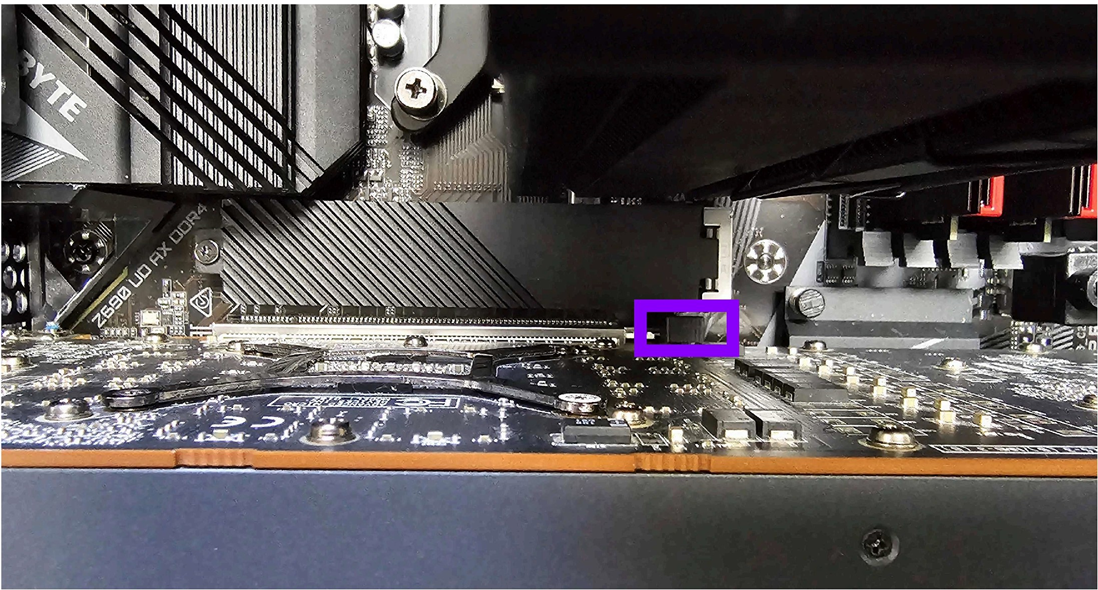 Prima di inserire la scheda grafica, assicurati che la chiusura sia in posizione aperta per evitare di danneggiare la scheda. Premi la scheda in modo uniforme sulla parte superiore fino a quando il fermo di bloccaggio si chiude e la scheda è fissata in posizione.