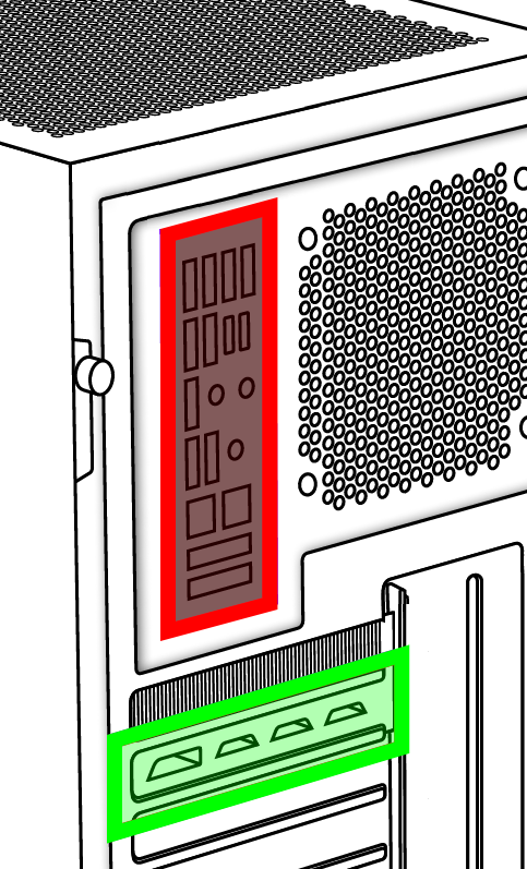 Se il tuo PC ha una scheda grafica dedicata, assicurati che il monitor sia collegato alla scheda (in verde) e non agli I/O della scheda madre (in rosso).