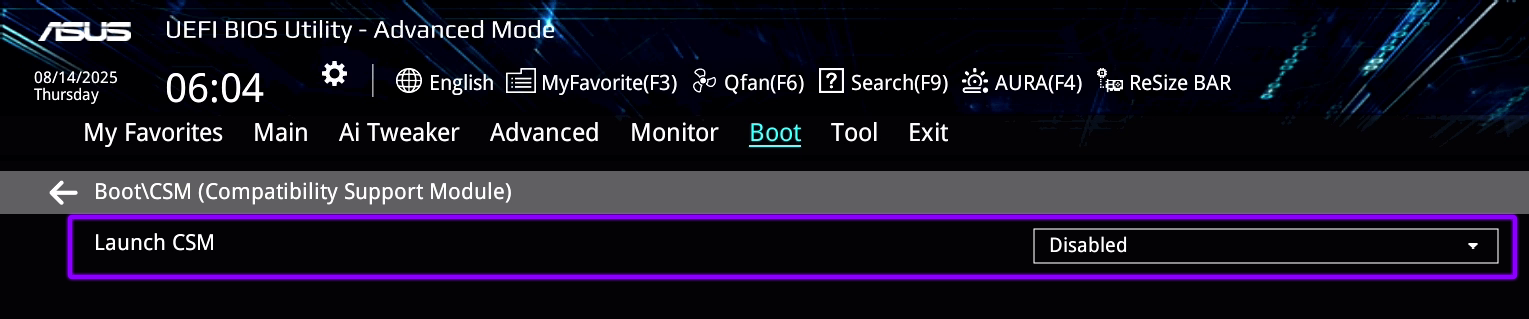 - Il Compatibility Support Module (CSM) è Disabilitato.