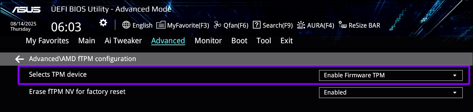 L'impostazione Select TPM device dovrebbe essere impostata su Enable Firmware TPM