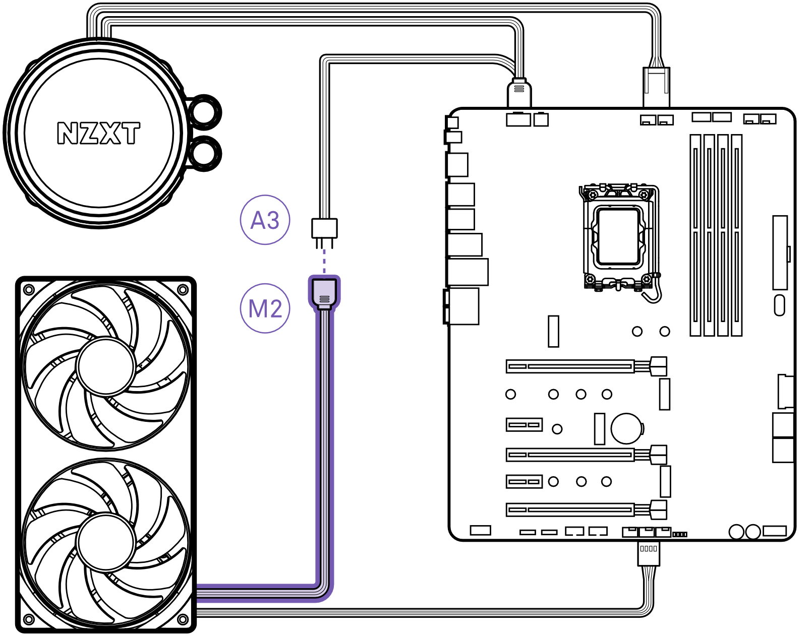 Come il Coperchio della Pompa, le ventole incluse con i modelli Kraken Core sopra indicati sono alimentate esclusivamente da ARGB indirizzabile a 5V che si trova su molte schede madri con nomi diversi come ADD_HEADER, JRAINBOW, D_LED, ADD_GEN2, ecc. Per maggiori informazioni consulta il manuale utente della tua scheda madre.