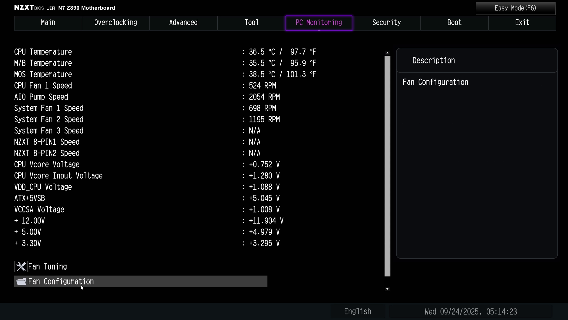 Una volta nel BIOS, dovrai aprire le impostazioni di Configurazione Ventola. A seconda della tua scheda madre, questa potrebbe essere immediatamente disponibile nella prima pagina o potrebbe trovarsi in un altro menu. Per le schede madri NZXT, questa si trova nella scheda PC Monitoring . Se la scheda madre è in Modalità Facile, potresti dover passare alla Modalità Avanzata per accedere a queste impostazioni.