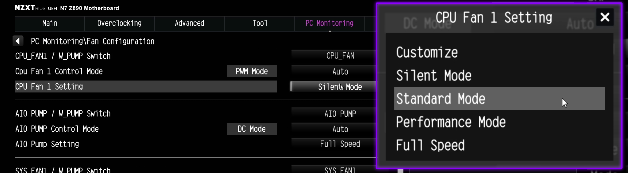 BIOSに入ったら、ファン設定を開く必要があります。マザーボードによっては、最初のページにすぐ表示される場合もあれば、別のメニュー内にある場合もあります。NZXTマザーボードの場合は、PC Monitoringタブにあります。マザーボードがEasy Modeの場合、これらの設定にアクセスするためにAdvanced Modeに切り替える必要があります。
