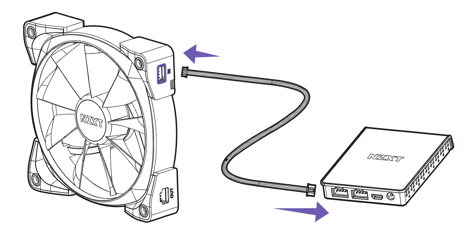 이 케이블로 팬을 연결하는 방법은 간단합니다. 클립이 달린 케이블의 큰 쪽 끝은 팬의 "OUT" 포트에 연결하고, 작은 쪽 끝은 체인의 다음 팬의 "IN" 포트에 연결합니다.