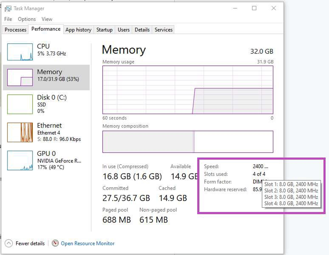 체크포인트 - PC가 Windows로 부팅할 수 있는 경우 두 RAM 모듈이 모두 감지되는지 확인합니다. 작업 관리자를 열고 성능 탭으로 이동하면 이 작업을 수행할 수 있습니다. 여기에서 슬롯 사용 정보 위에 마우스를 올려 어떤 슬롯이 감지되고 있는지 확인합니다. 채워진 슬롯이 비어 있는 것으로 표시되면 모듈이 고장난 것일 수 있습니다.