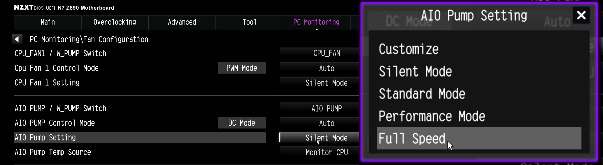 BIOS에 들어가면 팬 구성 설정을 열어야 합니다. 메인보드에 따라 첫 화면에서 바로 보일 수도 있고, 다른 메뉴에 위치할 수도 있습니다. NZXT 메인보드의 경우, PC 모니터링 탭에서 찾을 수 있습니다. 메인보드가 이지 모드라면, 해당 설정에 접근하기 위해 고급 모드 로 전환해야 할 수 있습니다.