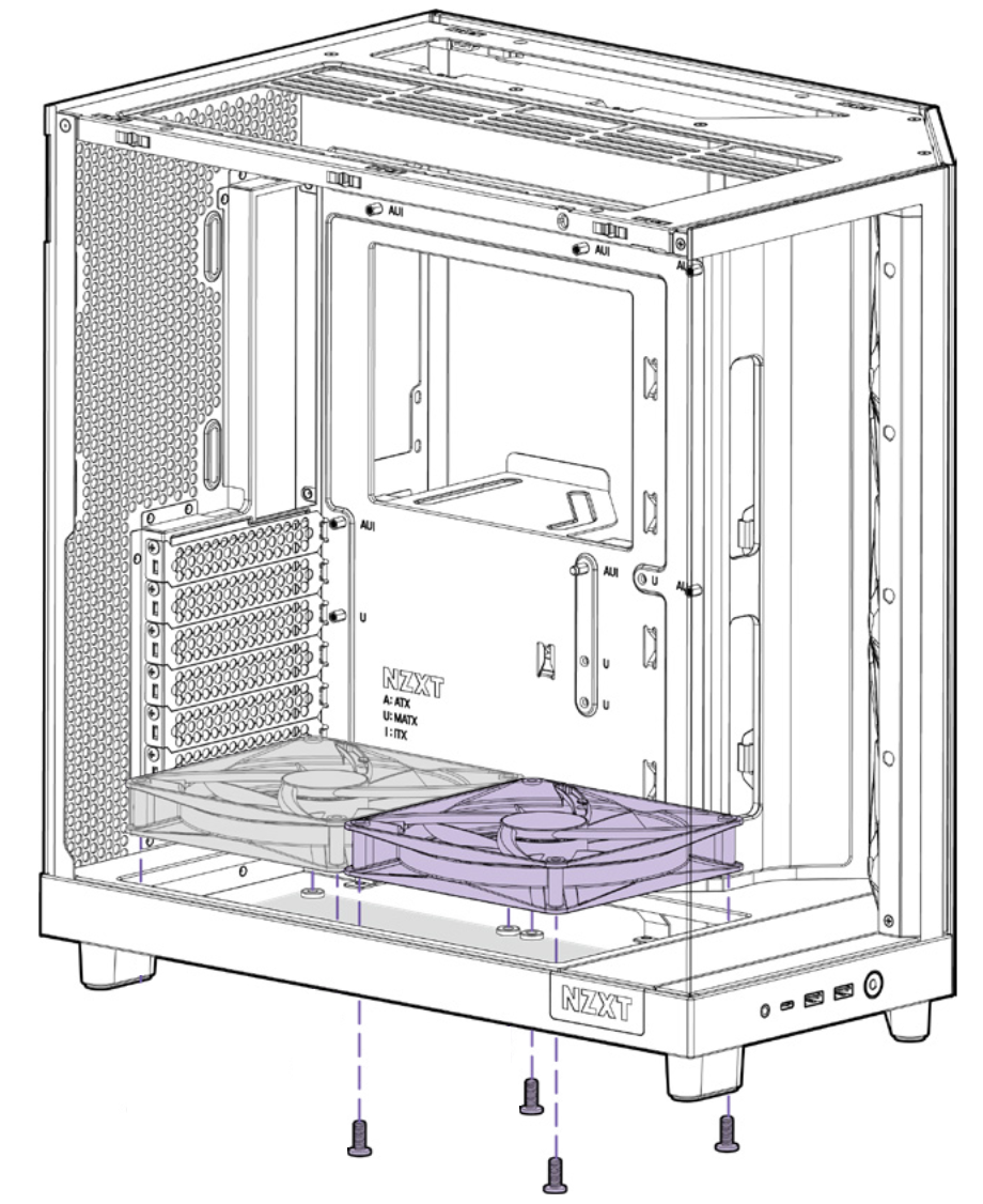 Se você adicionou um ventilador de 140 mm na parte inferior do gabinete, ele deve estar preso por quatro (4) parafusos auto-roscantes CB5. Recomenda-se removê-los usando sua chave de fenda Phillips #1, assim como com o ventilador frontal, para evitar desgastar a cabeça do parafuso.