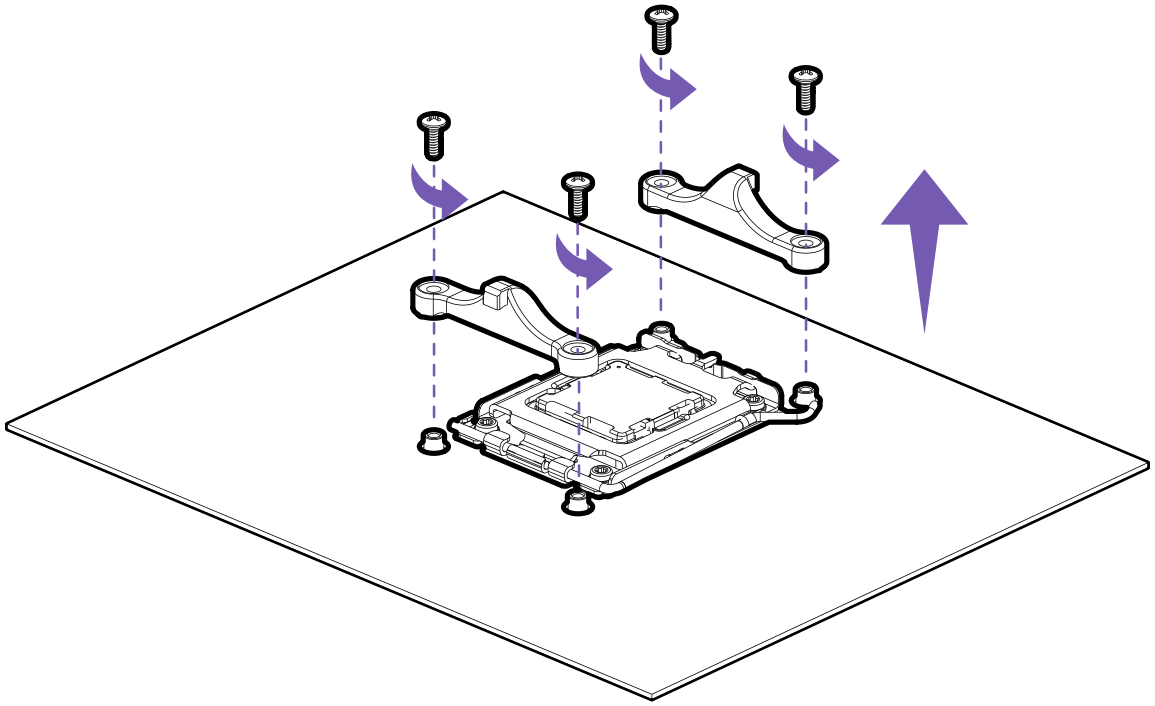 Alinhe a tampa da bomba com os quatro espaçadores, mantendo os tubos à direita do soquete da CPU. Fixe a tampa na placa-mãe usando os quatro (4) L Parafusos Universais de Retenção.