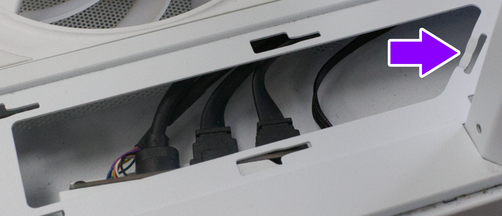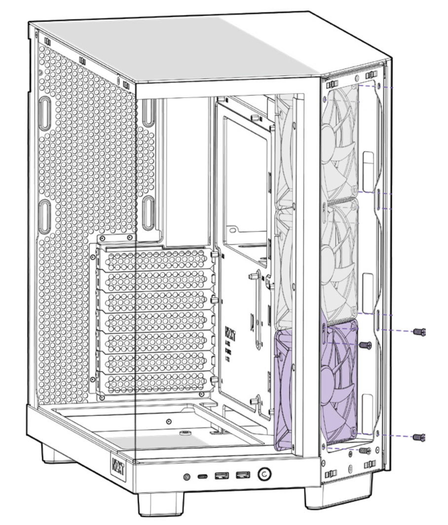Если вы добавили вентилятор 140 мм внизу корпуса, он должен быть закреплён четырьмя (4) саморезами CB5. Рекомендуется снимать их также с помощью отвёртки Phillips #1, как и передний вентилятор, чтобы предотвратить срыв головки винта.
