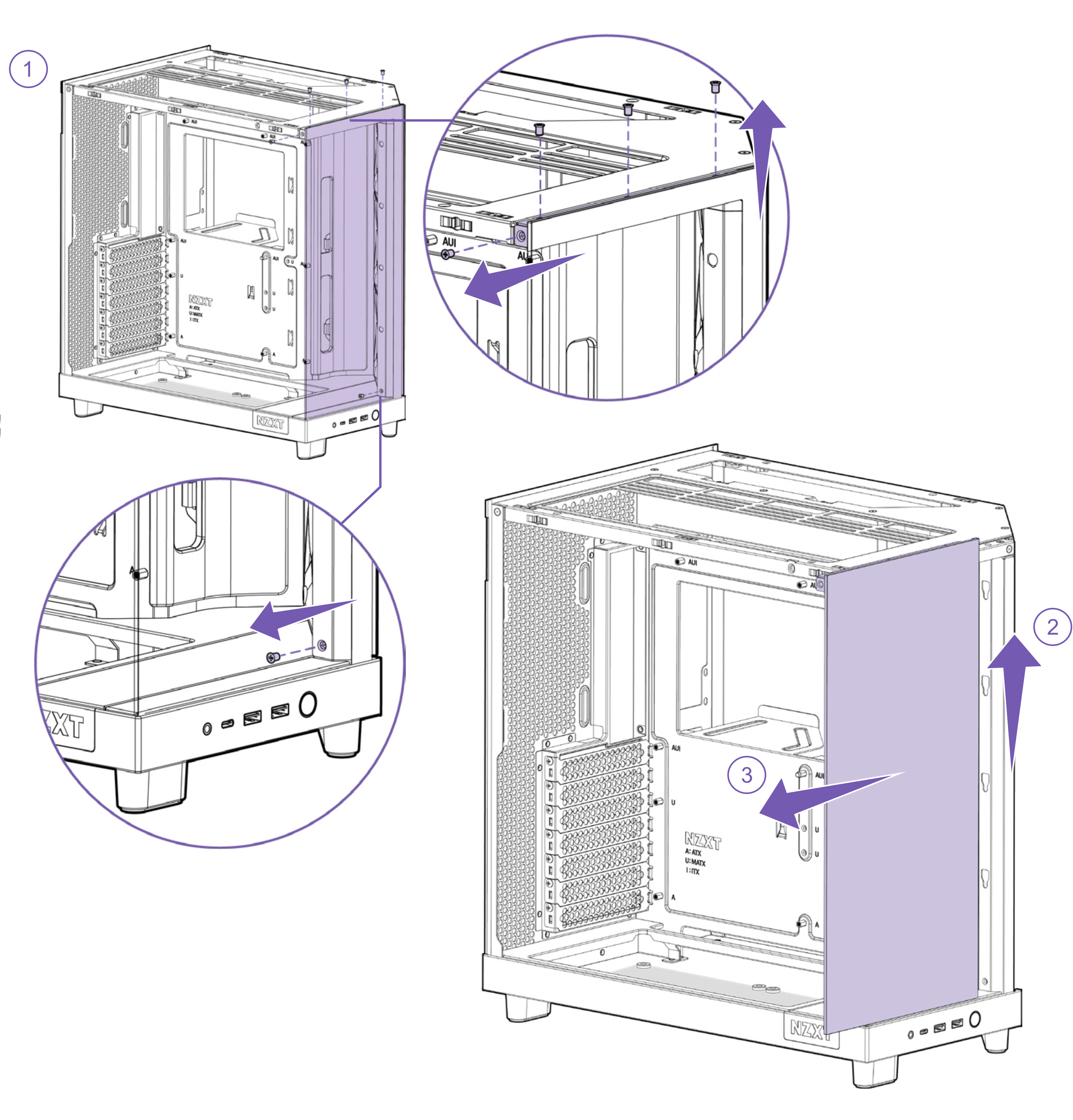 Благодаря преимущественно безинструментальному дизайну H6, снятие панелей корпуса чрезвычайно просто. Перед началом работы необходимо ослабить два фиксирующих винта с накатанной головкой, удерживающих большую стеклянную боковую панель и металлическую боковую панель.