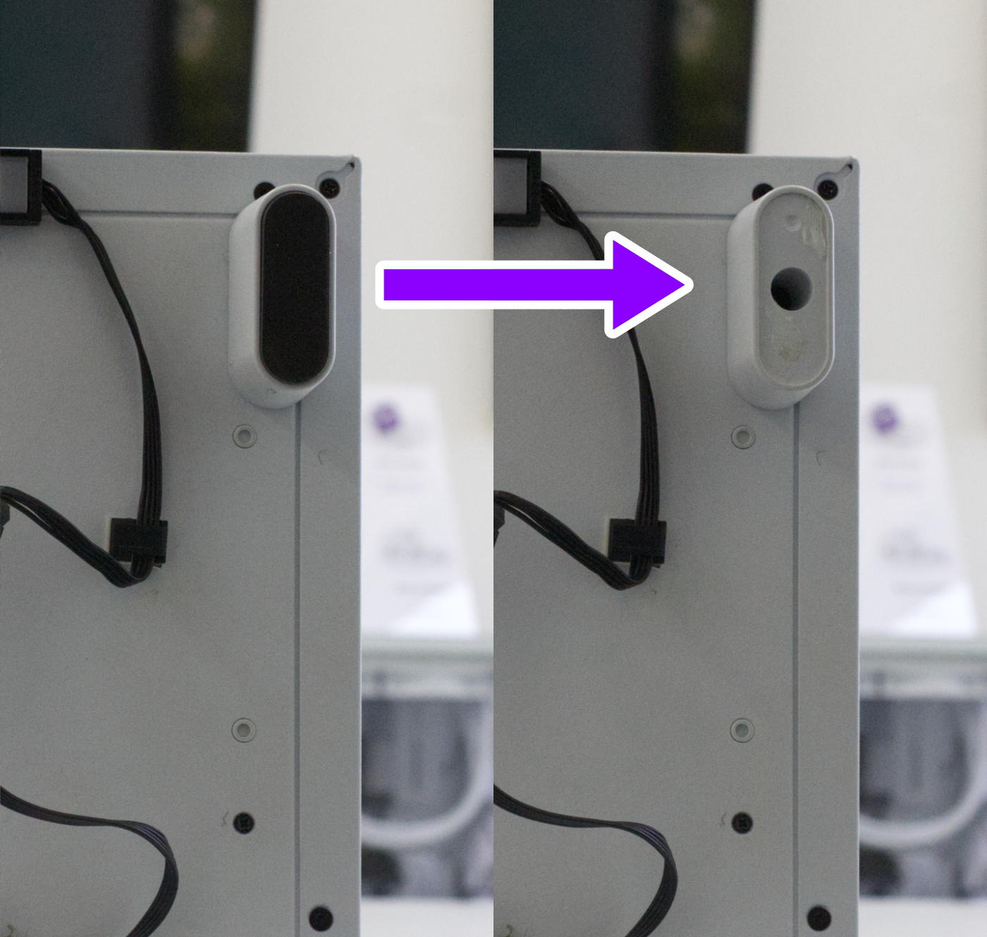 Для снятия маленькой передней стеклянной панели используйте отвёртку Phillips #0, чтобы открутить фиксирующие винты, удерживающие панель на месте, затем сдвиньте панель вверх и от корпуса. Это будут три (3) винта вдоль верхней части панели, один на внешнем крае сверху и один внутри корпуса внизу панели, как показано ниже: