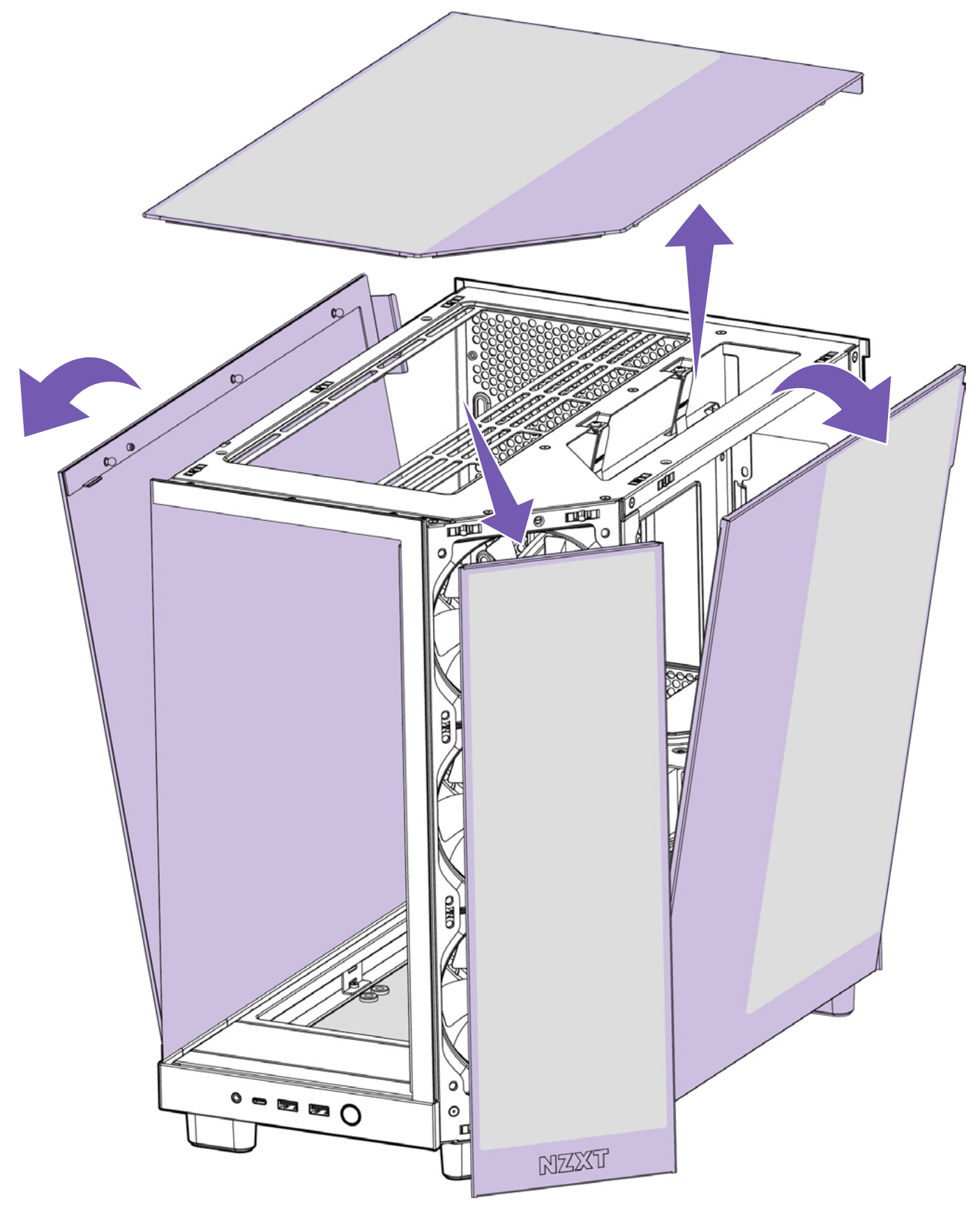 鬆開鎖定拇指螺絲後,您可以從機殼後方向上拉起頂部面板,接著依序拆除剩餘的側板(不含前方小玻璃面板),方法是從上方往外拉面板,如下圖所示。