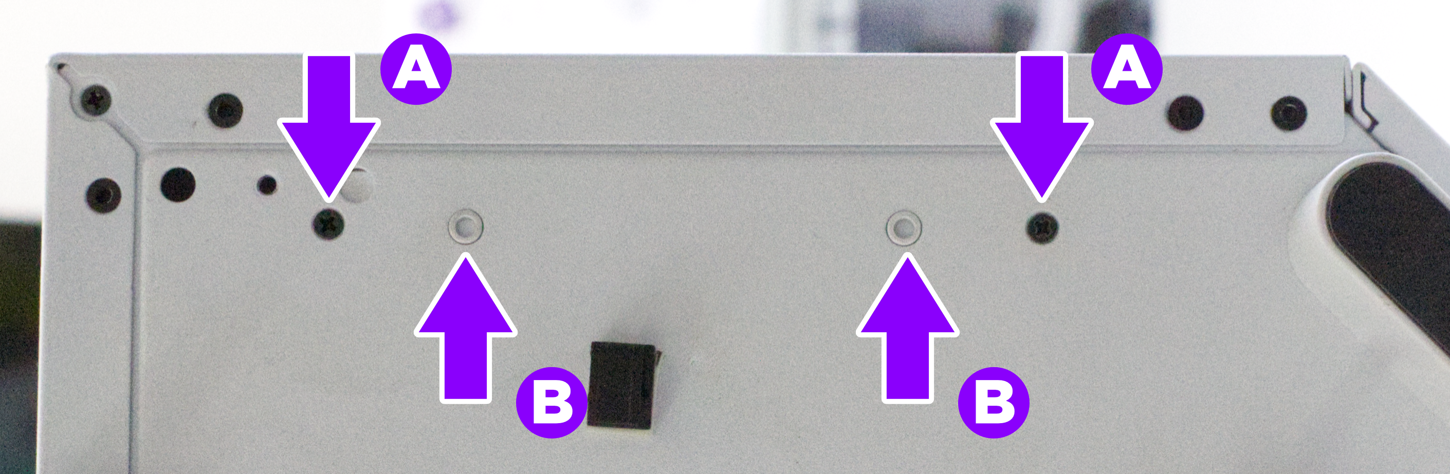 要拆卸前方小玻璃面板,請使用十字起子 #0 拆除固定面板的鎖螺絲,然後將面板向上滑出機殼。這些螺絲包括面板頂部的三顆,一顆在頂部外緣,以及一顆在面板底部機殼內側,如下圖所示: